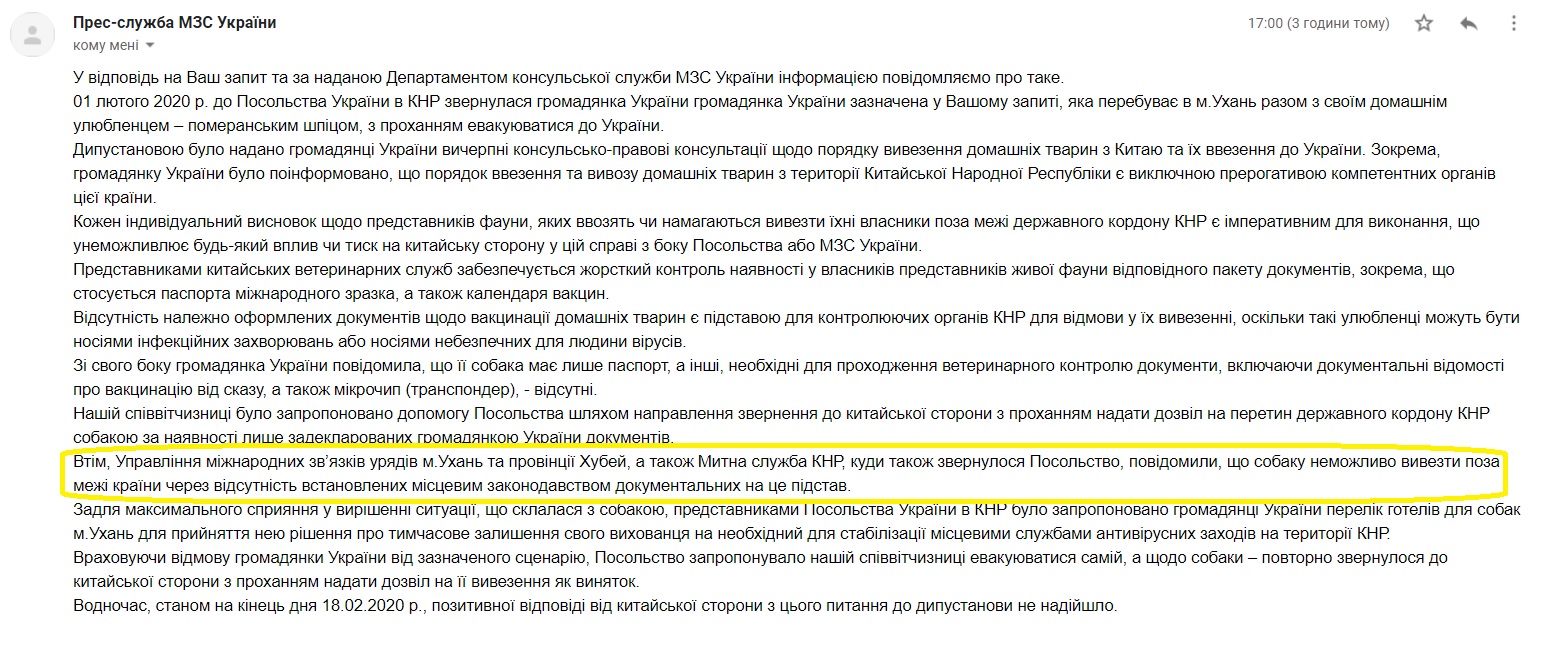 “Управління міжнародних зв’язків урядів м. Ухань та провінції Хубей, а також Митна служба КНР, куди також звернулося Посольство, повідомили, що собаку неможливо вивезти поза межі країни через відсутність встановлених місцевим законодавством документальних на це підстав”, – йдеться у відповіді МЗС.